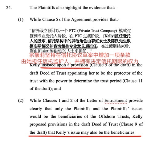 记者注意到,宗馥莉还坚持在协议草案中新增一项条款,规定由她担任离岸信托监护人,并拥有决定信托期限的权利。此外,由于宗馥莉在协议草案第9条提出了一些条款,使得其本人也可能成为信托受益人。法律文书中未列出条款的具体内容。此外,宗馥莉还提出了一项提议,将其子女纳入离岸信托受益人范围。
