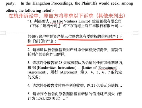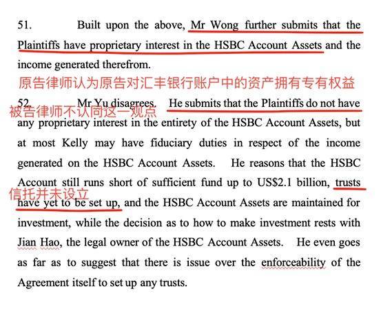 回看杭州中院诉讼案中,“宗家三兄妹”主张的是,汇丰银行账户内的资产(而非由此产生的收益)才是诉讼中的相关资产(信托资产)。