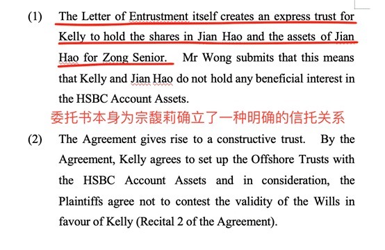 记者在梳理该法律文书时注意到,对于信托与受托关系,双方存在明显争议:“宗家三兄妹”认为委托协议给宗馥莉确立了一种信托关系,宗馥莉与建浩公司都不拥有汇丰银行账内资产的任何实际收益,“宗家三兄妹”拥有专有权益。