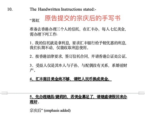 根据该法律文书,“宗家三兄妹”提交了三份文件:第一份,宗庆后给郭虹(曾任杭州娃哈哈饮料有限公司监事)的手写文件,未标注日期,内容提到办理“宗家三兄妹”的信托,“每人7亿美金”。