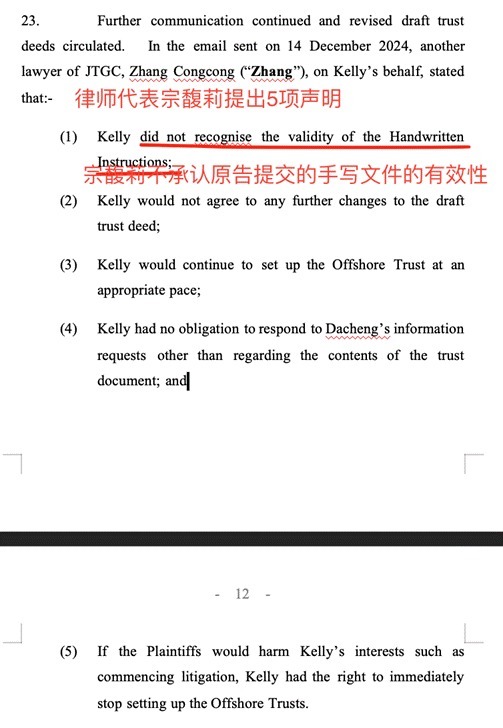 信托推进期间,双方就选择信托公司等事宜也产生了争议。“宗家三兄妹”认为宗馥莉方在拖延,宗馥莉则回应称,因存在分歧未推进信托计划,并非有意违反协议,她并不承认手写文件的有效性。