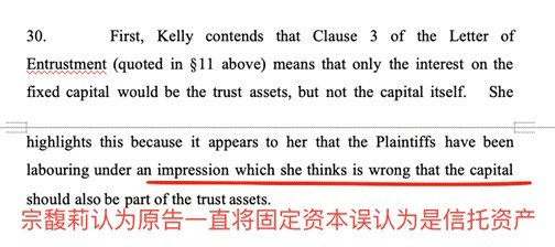 宗馥莉认为,只有固定资本的利息才是信托资产,而非固定资本本身。此外,每个信托注入7亿美元只是理想状态,并不现实。汇丰银行账内资产未达到21亿美元,“宗家三兄妹”不能主张各自拥有7亿美元权益。