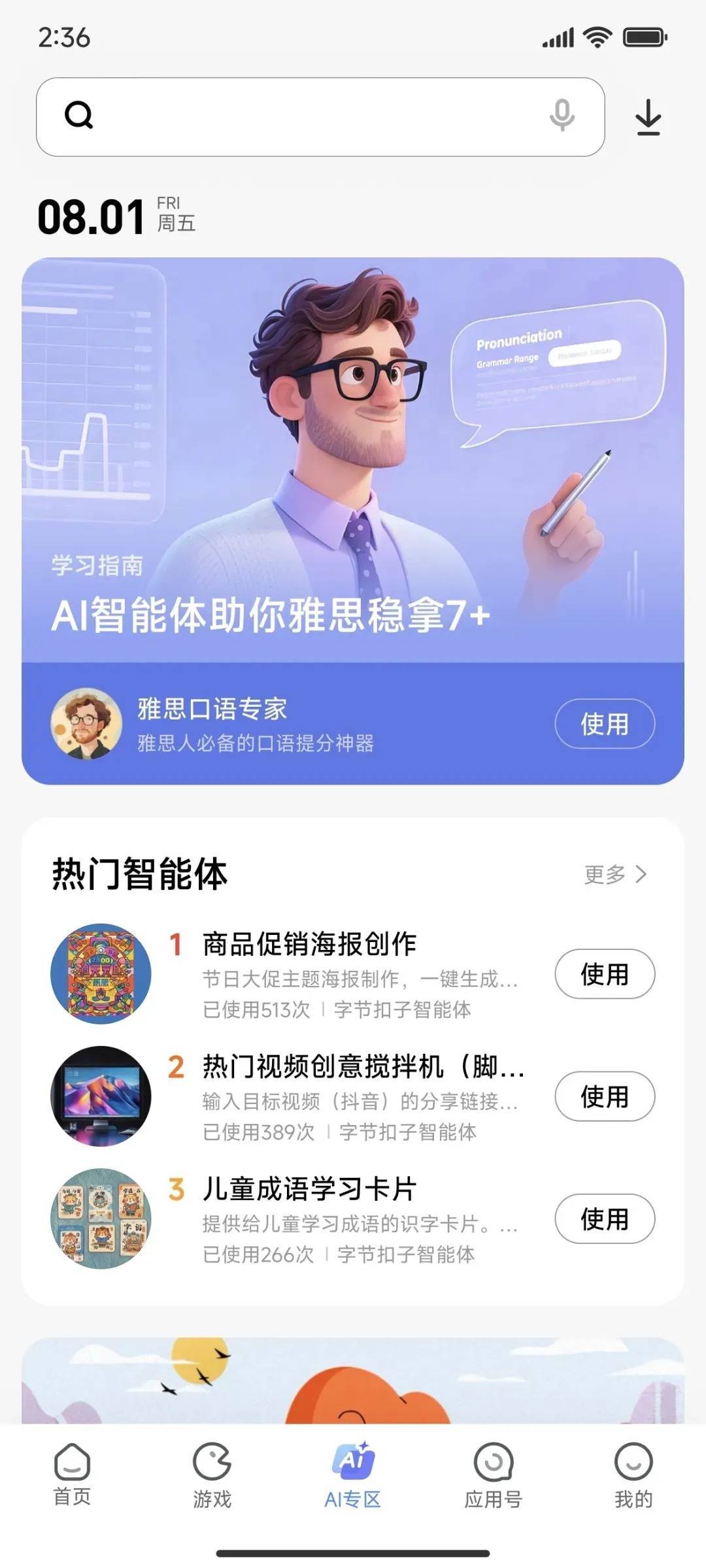 通过小米应用商店审核后,智能体将在小米应用商店上架。可通过小米应用商店搜索栏被用户搜索到,或在小米应用商店【AI智能体专区】查看,并调用智能体服务,即点即用。